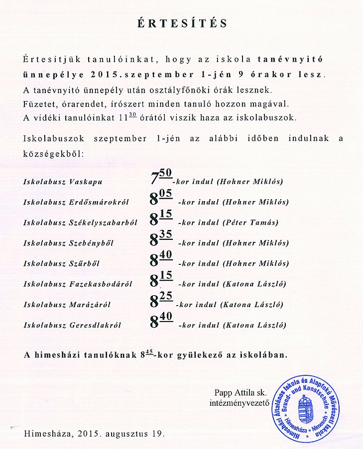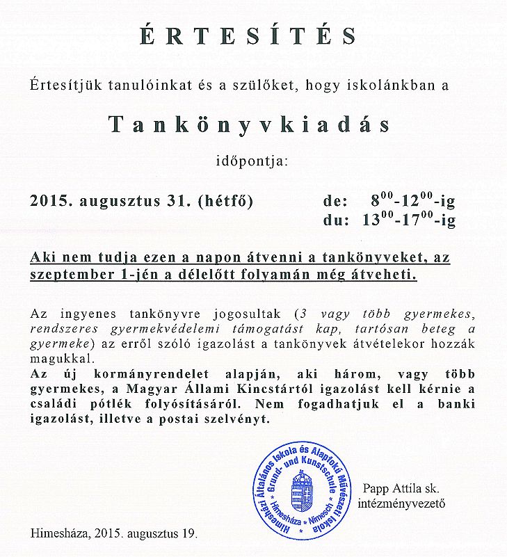 Az általános iskolai beiratkozás időtartama a 2015. április 16-ától 2015. augusztus 31-éig tartó időszak.