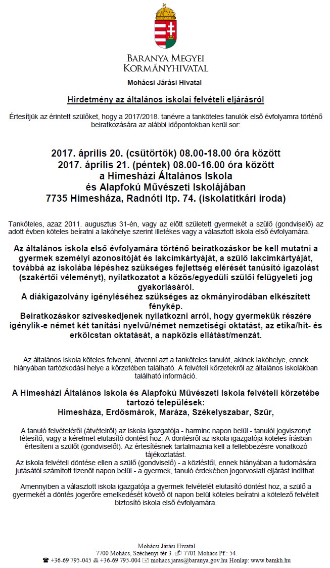 A szülő (gondviselő) az adott évben tanköteles korba lépő gyermeket a fenti időpontban köteles beíratni a lakóhelye szerint illetékes vagy a választott iskola első évfolyamára.