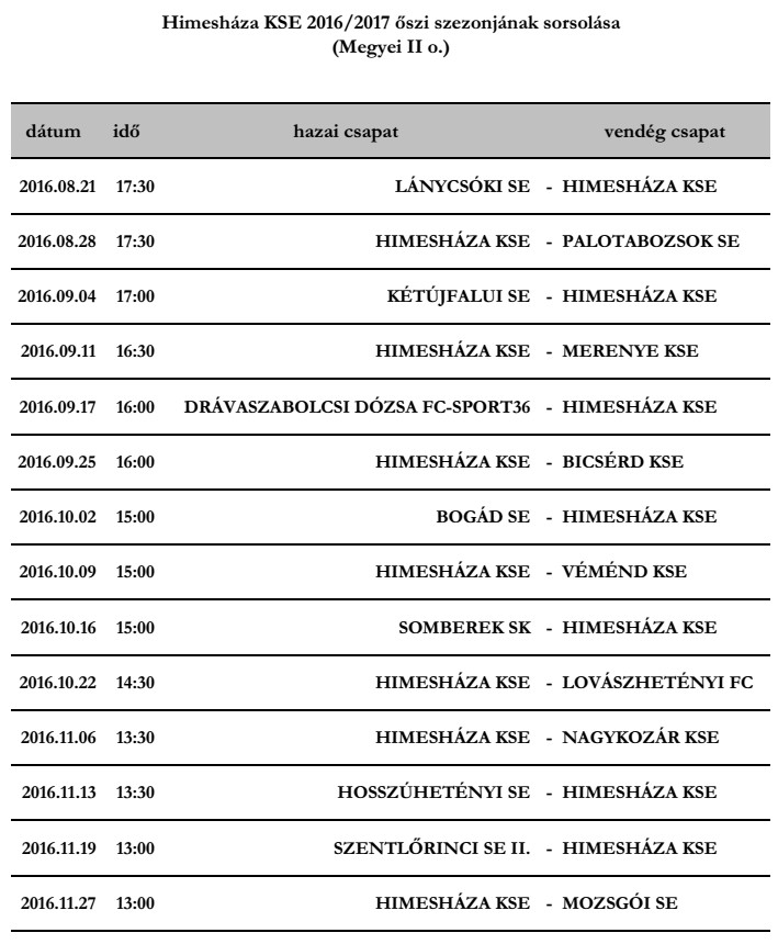 Himesháza KSE 2016/2017 őszi szezonjának sorsolása és eredményei