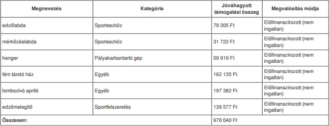A Lombfújó gép és az öntözőrendszer kiépítése megnevezésű projektelem megvalósítását az MLSZ hatósági jogkörében eljárva nem támogatja.