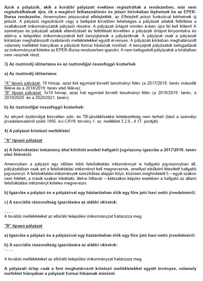 Azok a pályázók, akik a korábbi pályázati években regisztráltak a rendszerben, már nem regisztrálhatnak újra, ők a meglévő felhasználónév és jelszó birtokában léphetnek be az EPER-Bursa rendszerbe. Amennyiben jelszavukat elfelejtették, az Elfelejtett jelszó funkcióval kérhetnek új jelszót. A pályázói regisztrációt vagy a belépést követően lehetséges a pályázati adatok feltöltése a csatlakozott önkormányzatok pályázói részére. A pályázati űrlapot minden évben újra fel kell tölteni! A személyes és pályázati adatok ellenőrzését és feltöltését követően a pályázati űrlapot kinyomtatva és aláírva a települési önkormányzatnál kell benyújtaniuk a pályázóknak. A pályázat csak a pályázati kiírásban meghatározott csatolandó mellékletekkel együtt érvényes. A pályázati kiírásban meghatározott valamely melléklet hiányában a pályázat formai hibásnak minősül. A benyújtott pályázatok befogadását az önkormányzat köteles az EPERBursa rendszerben igazolni. A nem befogadott pályázatok a bírálatban nem vesznek részt.