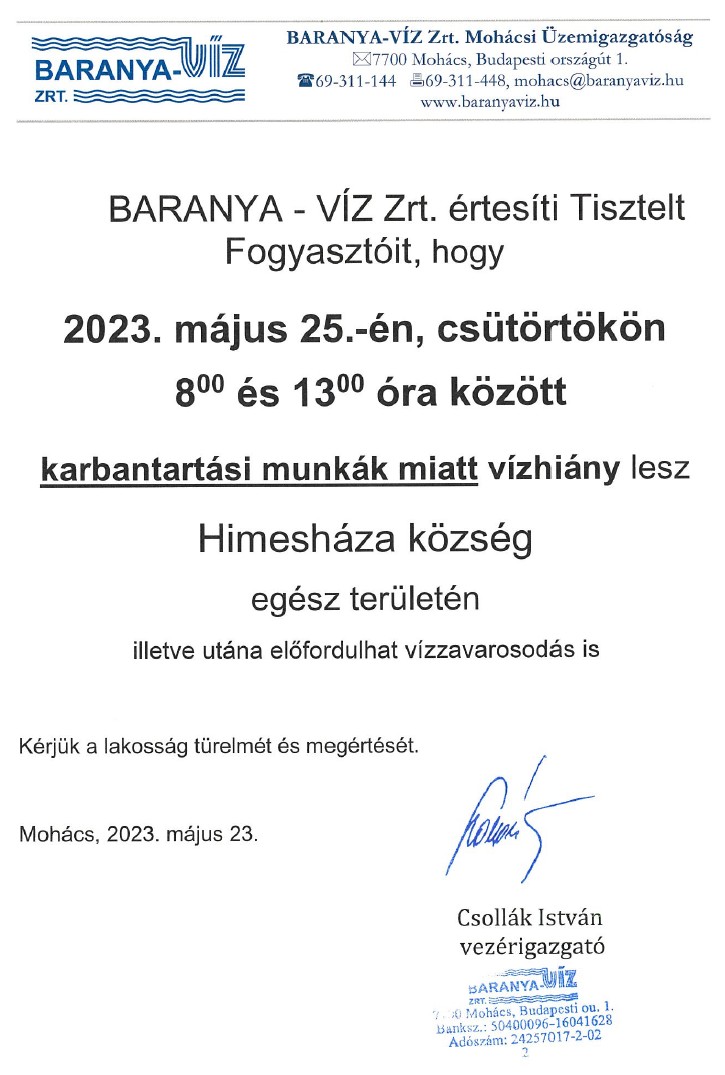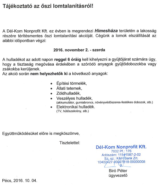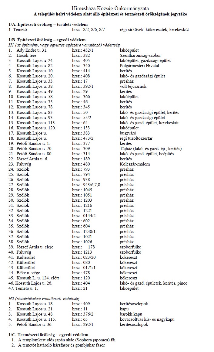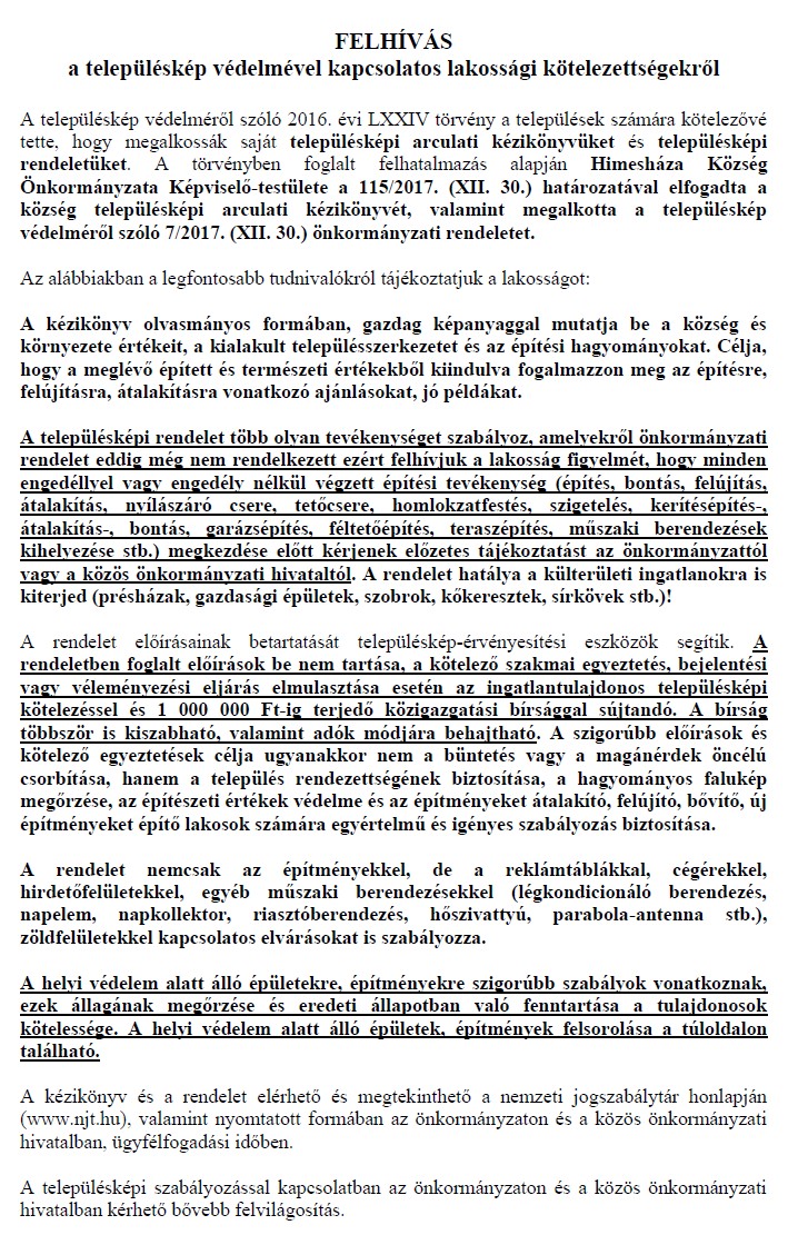 A választási eljárásról szóló 2013. évi XXXVI. tv. 75. szakasz (1) bekezdésének b) pontja alapján a Himesháza községben helyi önkormányzati polgármester és képviselő, valamint német nemzetiségi önkormányzati képviselő választáson induló jelöltek névsorát a Helyi Választási Bizottság által kisorsolt sorrendben az alábbiak szerint teszem közzé: