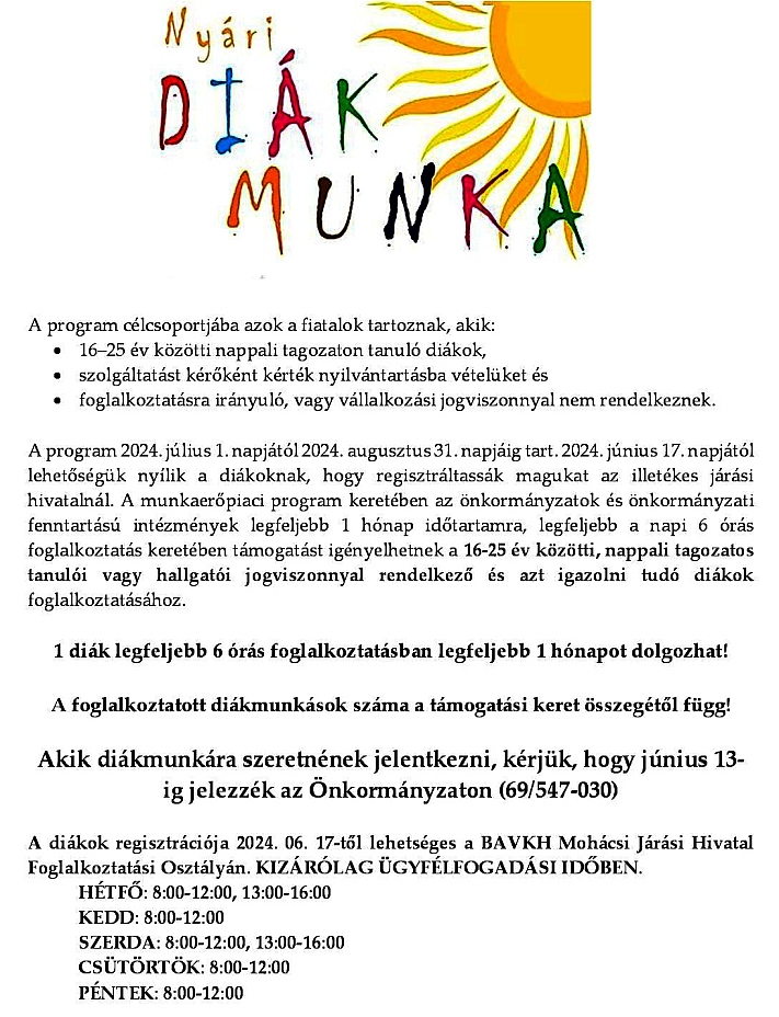 - Akik diákmunkára szeretnének jelentkezni, kérjük, hogy június 4-ig jelezzék az Önkormányzaton (69/547-030);